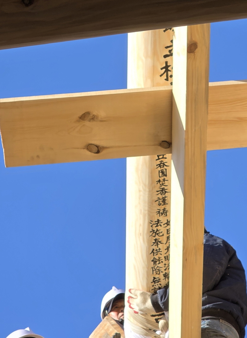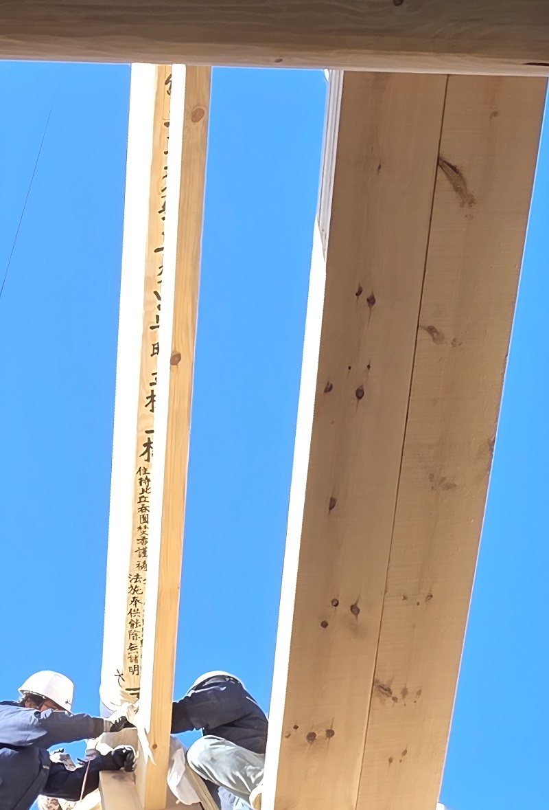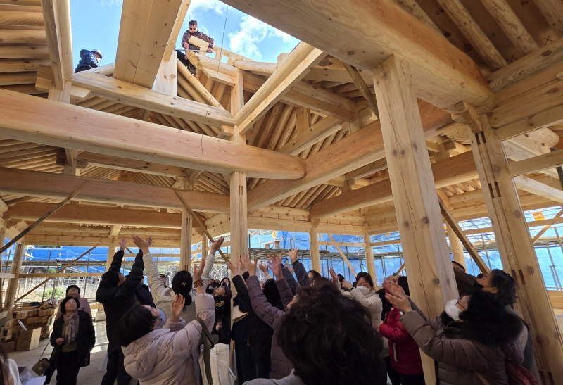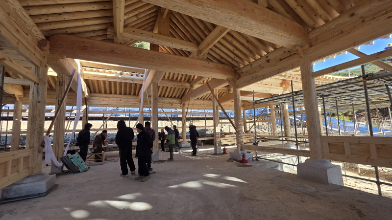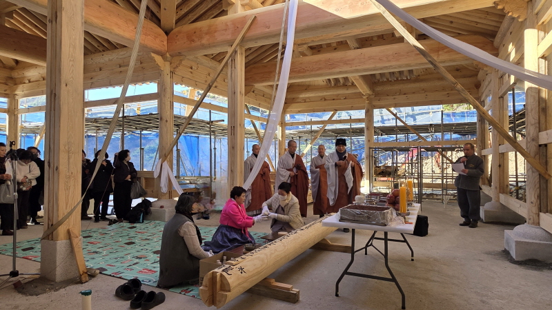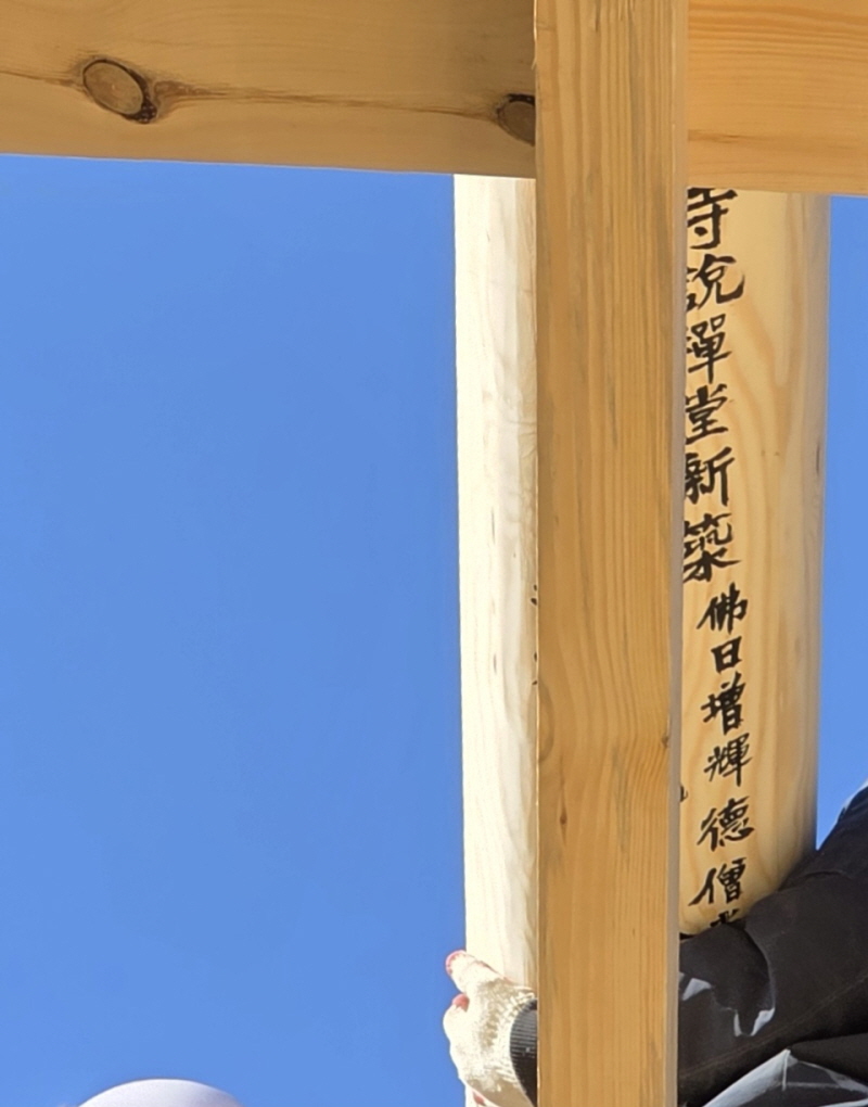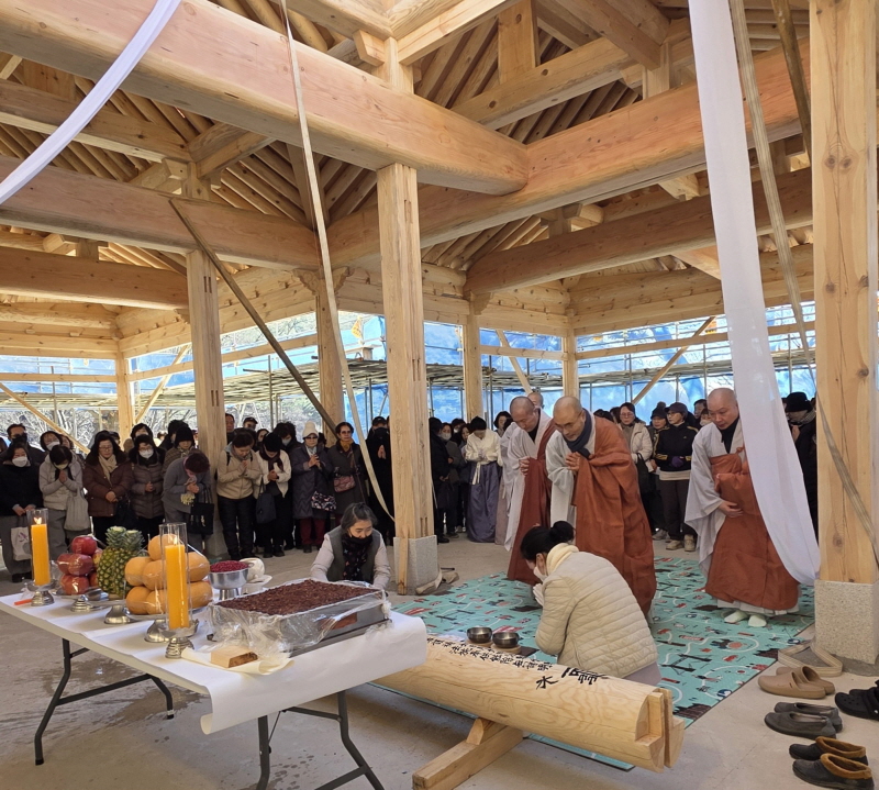 설선당 신축 상량식 법회에 참석한 신도들과 사부대중이 상량 대들보를 올리며 불사의 원만회향을 기원하고 있다._()_