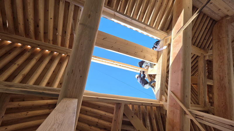 설선당 신축 불사의 원만회향을 기원하며 상량 대들보를 올리고 있다.